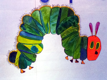 This caterpillar backdrop was used for a birthday event. The backdrop is made of styrofoam, to be colored and brushed with house paint and glitters added to it.
