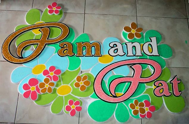 This backdrop with the words Pam and Pat was used for a wedding event. The backdrop is made of styrofoam, to be colored and brushed with house paint.