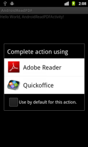 This helper method opens a PDF file from your Android app using any PDF related app installed in the smart phone. This is made possible with the use of an Intent object and setting its data and type so that it will recognize that it will be opening a PDF file.