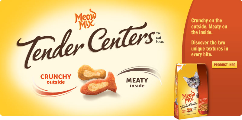 The Meow Mix Tender Centers cat food is crunchy outside, meaty inside, and made with the tasty flavors of white meat chicken and salmon. It’s two textures and flavors in perfect harmony. Meow Mix Tender Centers, the taste cats ask for by name.