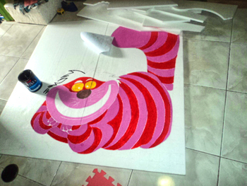 The famous cat in Alice in Wonderland, the Cheshire Cat is shown in its early stages of creating this backdrop. The materials used are made of styrofoam, colored and brushed with house paint and glitters were added to it.