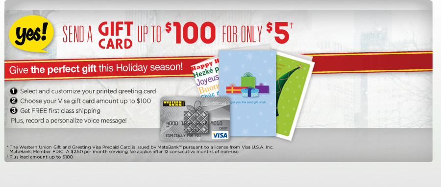 The Western Union® gift card is issued by MetaBank™ pursuant to a license from Visa U.S.A. Inc. MetaBank; Member FDIC. A $2.50 per month servicing fee applies after 12 consecutive months of non-use.